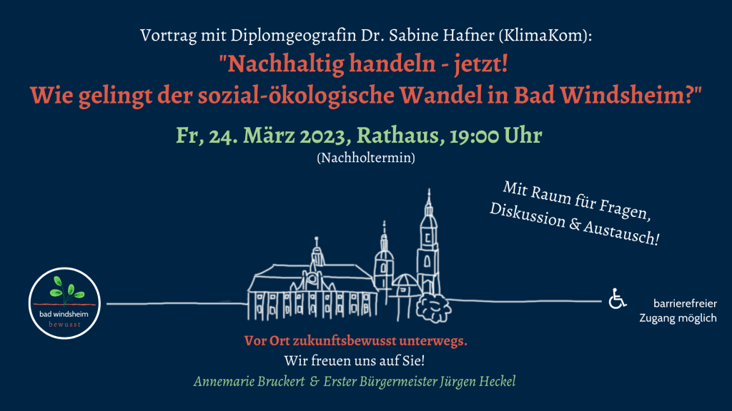 Wie gelingt der sozial-ökologische Wandel in Bad Windsheim? Beim letzten Mal haben wir uns dieser Frage aus unterschiedlichen Perspektiven Schritt für Schritt angenähert. Wir haben eine Bestandsaufnahme gemacht, wo hakt es? Was braucht es? Wo steht Bad Windsheim heute? Am 24. März ab 19 Uhr im Rathaus Bad Windsheim wird uns Dr. Sabine Hafner einen Rund-um-Blick über mögliche konkrete Maßnahmen für Bad Windsheim, Beispiele aus anderen Kommunen und die nötigen Zutaten für eine erfolgreiche Zusammenarbeit zwischen der Stadt, der Bürgerschaft und zivilgesellschaftlich Engagierten geben.