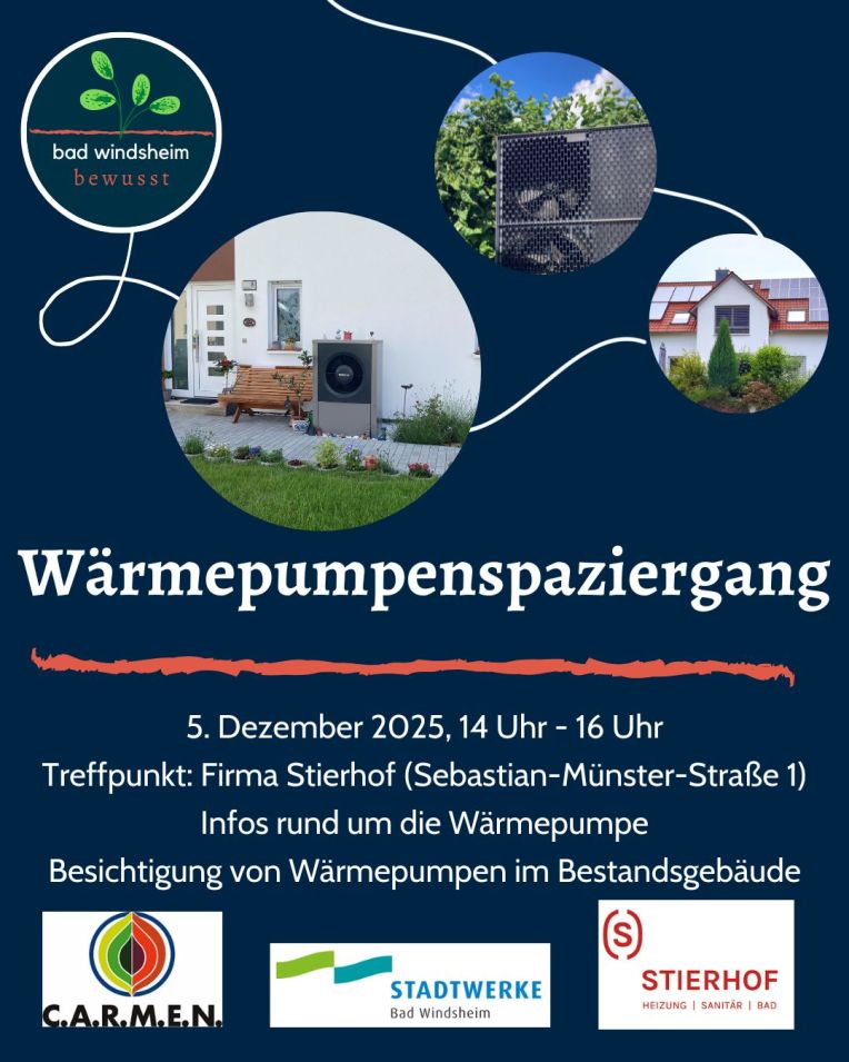 Badwindsheimbewusst e.V. und die Stadtwerke Bad Windsheim laden am 5. Dezember 2025 zu einem informativen Wärmepumpenspaziergang ein. Die Veranstaltung richtet sich an private Gebäudeeigentümerinnen und -eigentümer, die sich praxisnah über Wärmepumpen als Heiztechnik informieren möchten.