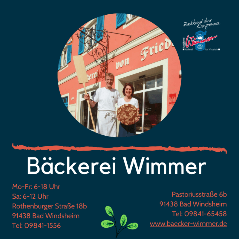 „Als familiengeführtes Unternehmen sind wir in Bad Windsheim fest verwurzelt – die Geschichte der Bäckerei reicht bis ins Jahr 1746 zurück. Unser heutiger Familienbetrieb wird von uns, Bäcker- und Konditormeister Friedrich Wimmer und Alexandra Wimmer, geleitet.“